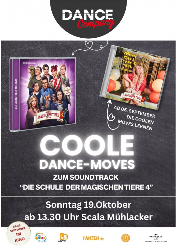 Coole Dance Moves: Die DANCE COMPANY tanzt mit ihren Kids am 19.10. um 13.30 Uhr draußen vor dem Kino 2-3 Tänze. Es wird auch für alle weiteren Kids eine Mitmachaktion geben! Ebenso dann kurz vor Filmstart im Kinosaal noch ein Mitmachtanz. Schnell Plätze buchen und dabei sein!